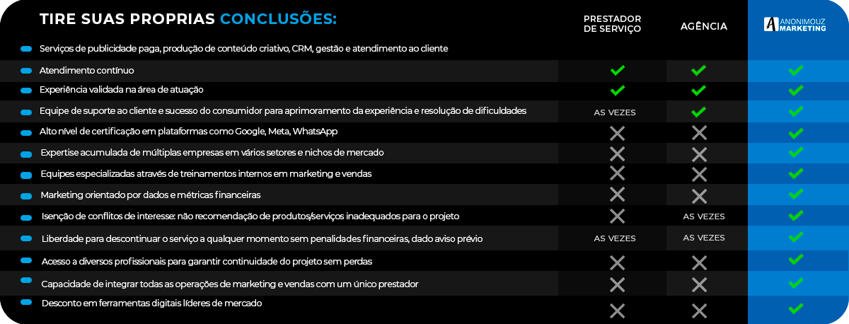 Adquira um apoio adicional para auxiliar sua equipe ou delegue toda a gestão de marketing à Anonimouz, assim você elimina a preocupação com recrutamento, coordenação dessa equipe, encargos trabalhistas e demais formalidades.
